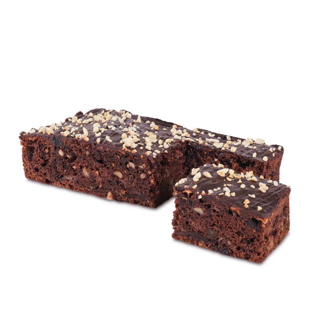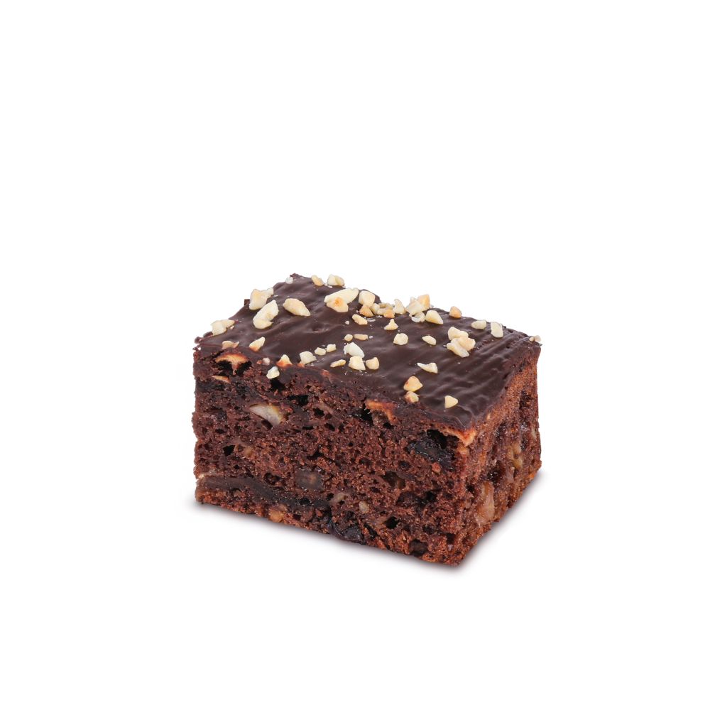 Kakaowe ciasto z dodatkiem prażonych jabłek, orzechów oraz rodzynek, oblane polewą czekoladową i posypane orzechami.