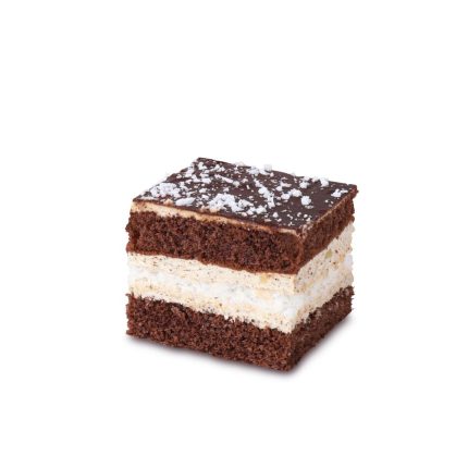 Ciekawa kompozycja ciasta biszkoptowego połączonego masą cappuccino, oblanego polewą czekoladową z wiórkami kokosowymi.