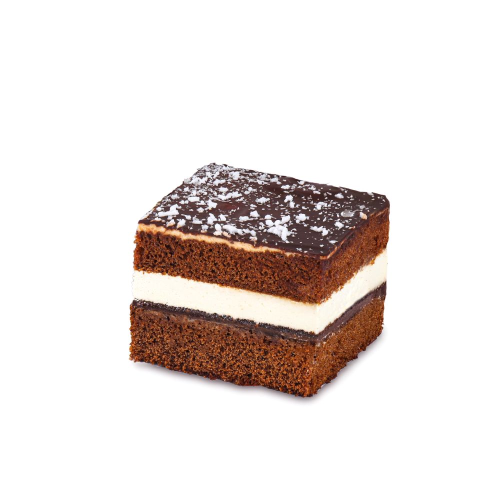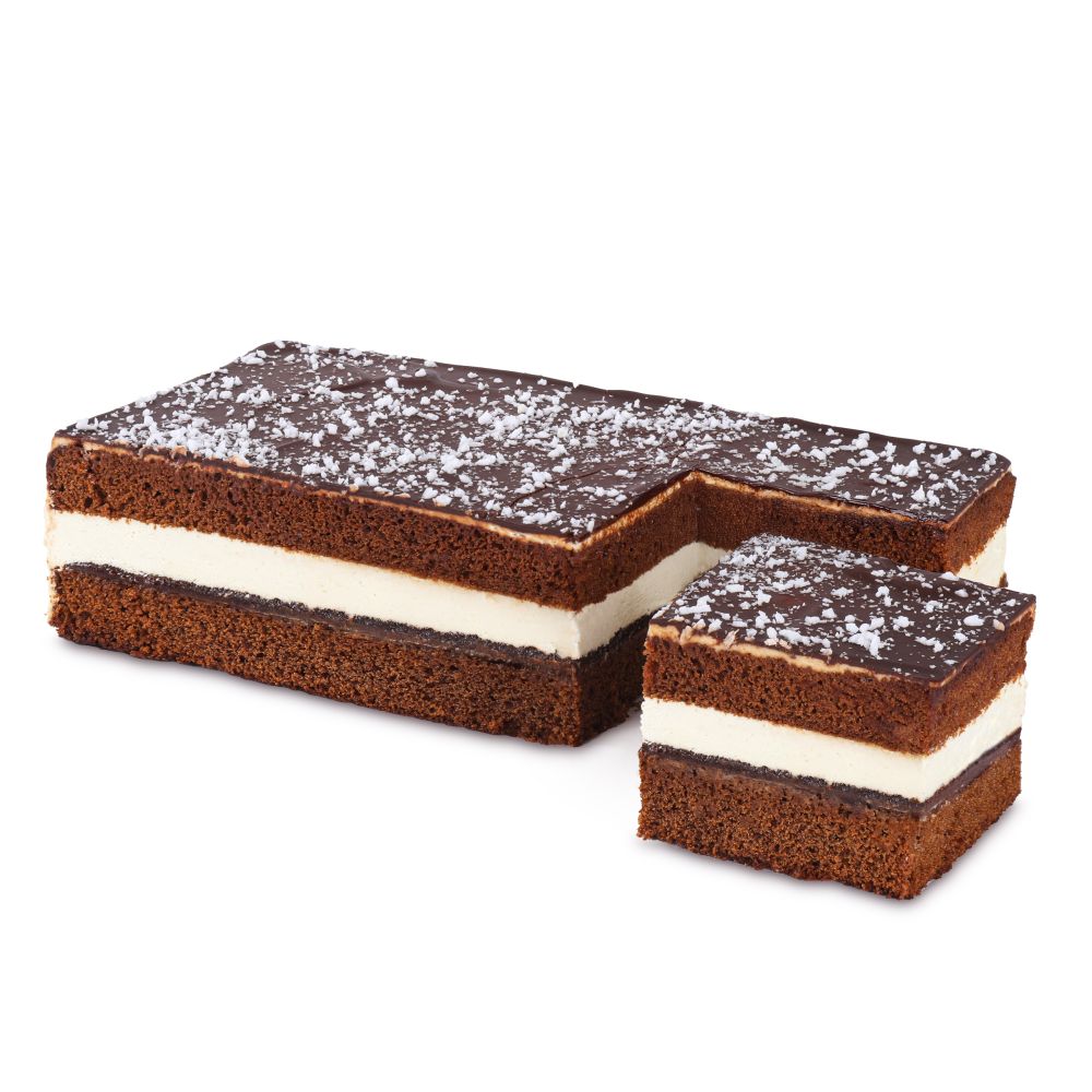 Mocno czekoladowe ciasto przekładane musem czekoladowym, wiśniami i powidłami śliwkowymi.