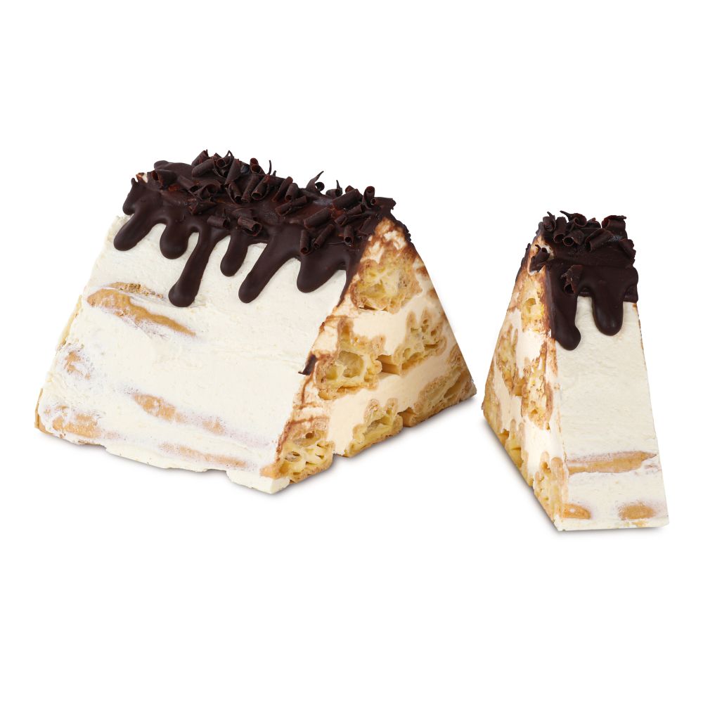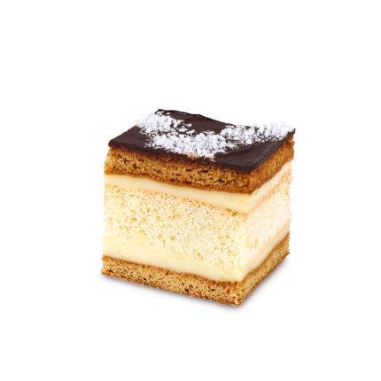Delikatny budyniowy krem otulony kruchym i biszkoptowym ciastem, oblany polewą czekoladową z wiórkami kokosowymi.