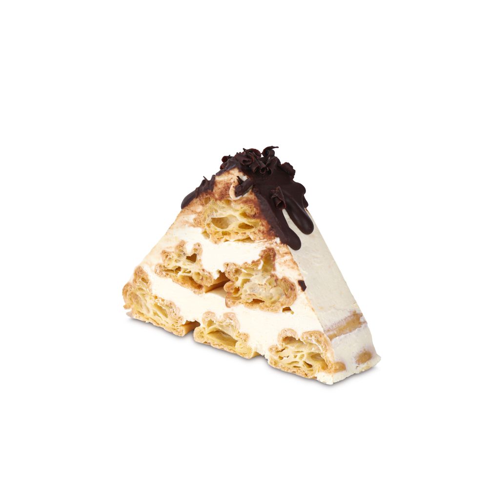 Ptysiowe ciasto z budyniową masą, w kształcie piramidy.