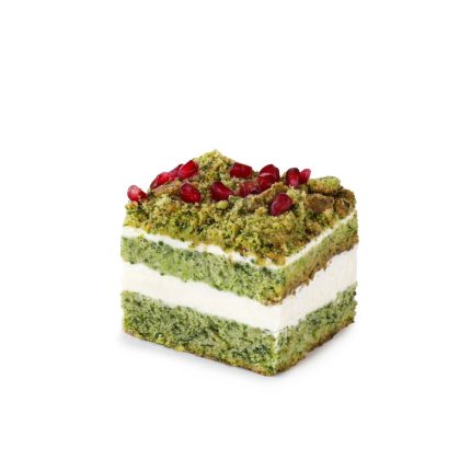 Efektowne ciasto ze szpinakiem przełożone kremem mascarpone i udekorowane kuleczkami granatu.